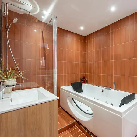 Le Dalmatie - Sauna - Jacuzzi - Clim - Gare Sncf apartment offers a patio and a seating area, as well as comforts like an air conditioner. This property offers guests the convenient feature of towels in the bathroom. A spa bathtub, a hot tub, and a separate toilet can also be found.